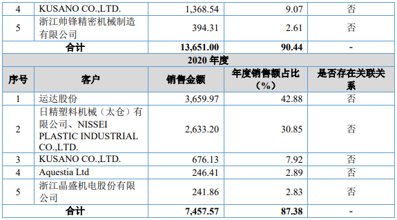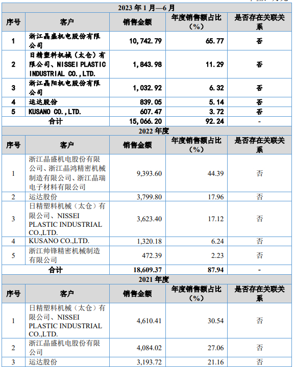 2020-2023年1-6月,公司前五大客户的销售收入分别为7,457.57万元、13,651.00万元、18,609.37万元和15,066.20万元,占公司当期营业收入的比例分别为87.38%、90.44%、87.94%和92.24%。报告期内,坤博精工存在客户集中度较高的情况。