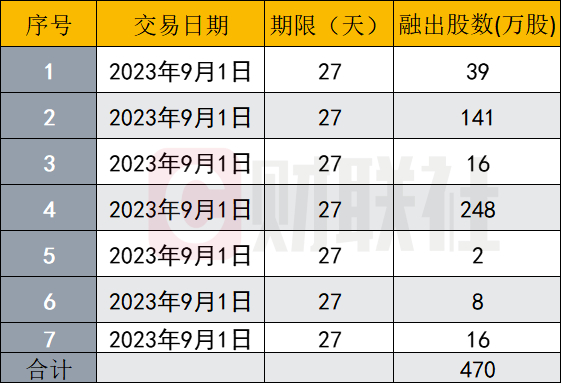 根据Wind数据,金帝股份在上市首日(9月1日)的出借合约均为27天期限,即合约在9月28日到期,当日必须归还转融通合约。