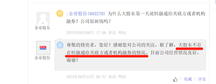 金帝股份在上证e互动回应称,公司已将限售股权按照规定进行系统登记;据了解,大股东不存在转融通给关联方或者机构融券的情况。