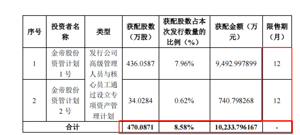 金帝股份首发发行结果公告显示,公司高管与核心员工参与本次战略配售设立的专项资产管理计划,总计两份,合计获配470.09万股,获配金额为1.02亿元,限售期为12个月。