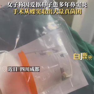 【#女生称因爱抠鼻子致鼻内长10多团真菌#:希望大家不要再挖鼻孔】近日,四川成都。女子称因爱用手抠鼻子导致患上鼻窦炎,多年未愈并时常头痛,目前手术后从蝶窦里取出10多个真菌团。当事人阚女士称,自己得鼻窦炎已经六七年了,当时做核磁共振发现自己蝶窦里有阴影,但没有勇气做手术。今年鼻炎又犯了,头痛加重,检查后医生说要马上做手术。手术后鼻子里塞满了棉球,只能用嘴巴呼吸。现在自己已经出院了,但术后恢复期会很长。想提醒大家不要再用手挖鼻孔,严重的话会像自己这样真菌感染。@白鹿视频