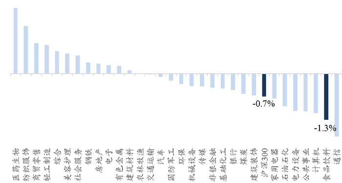1、9月15日食品饮料板块跌1.3%,跑输沪深300指数0.6pct,在申万31个子行业中排名第30。