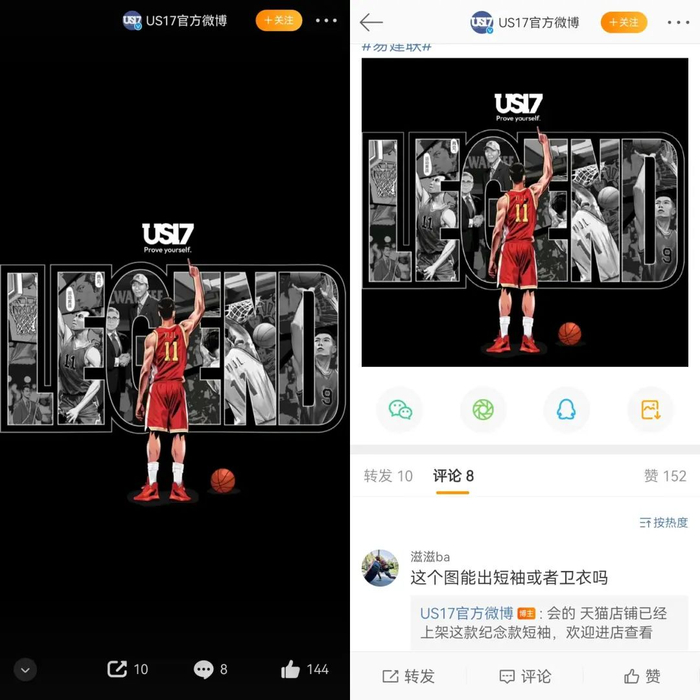 2014年,易建联就创办了自己的潮牌“US17”,售卖与自己相关的周边服饰,这次易建联宣布退役后,“US17”的官方微博还蹭了蹭老板的热度,表示天猫旗舰店已经在发售相关纪念款短袖。