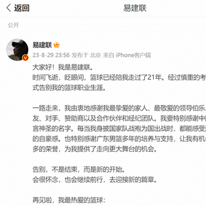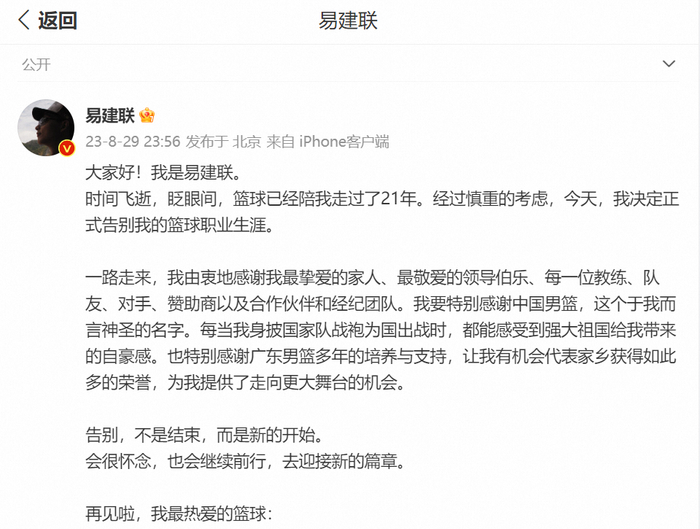 2023男篮世界杯还在进行,8月29日深夜,易建联在微博发出博文,宣布了自己正式告别篮球职业生涯。