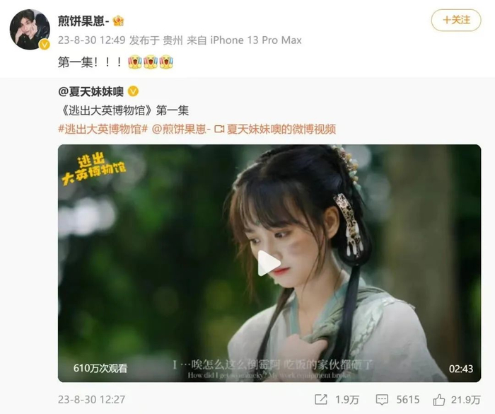 “你要带我回中国吗?”近日,一部短视频剧集《逃出大英博物馆》一经上线,迅速火爆出圈,预告片和正片每集不到10分钟却是细节满满,制作精心,在某短视频平台点赞量播放量均超过数百万次,短时间内登顶多个平台的热榜。