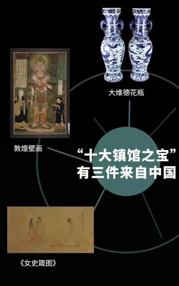 大英博物馆中的33号展厅,是专门陈列中国文物的永久性展厅,其“十大镇馆之宝”中,就有三件来自中国——《女史箴图》、敦煌壁画、大维德花瓶。大英博物馆对中国文物的介绍中,第一句话是这样写的:“中国人创造了世界上最博大和悠久的文明……”。