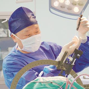 DBS治疗帕金森病,其核心就是定位要精准。所要“瞄准”的目标是藏在大脑深部的神经核团,直径只有几毫米。确定靶点则需要通过核磁共振技术对患者的大脑进行成像,得到大脑三维结构图,再在患者头部安装金属定向头架,行头颅CT扫描,计算出电极放置的位置。