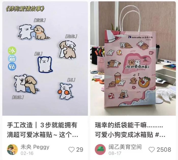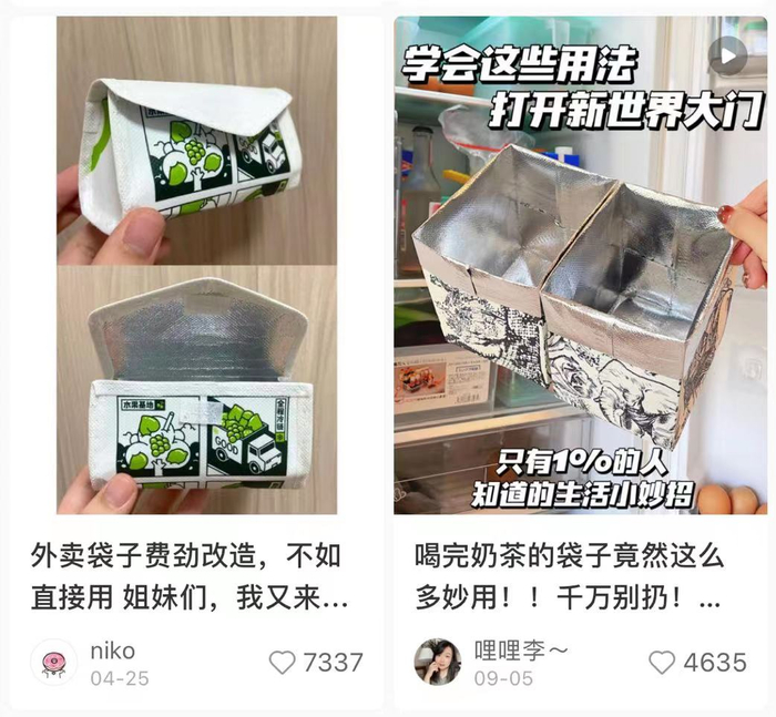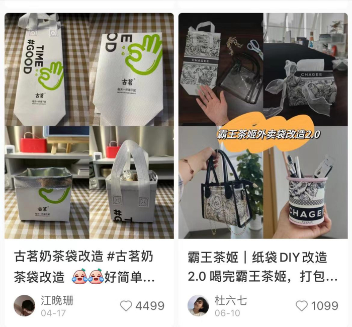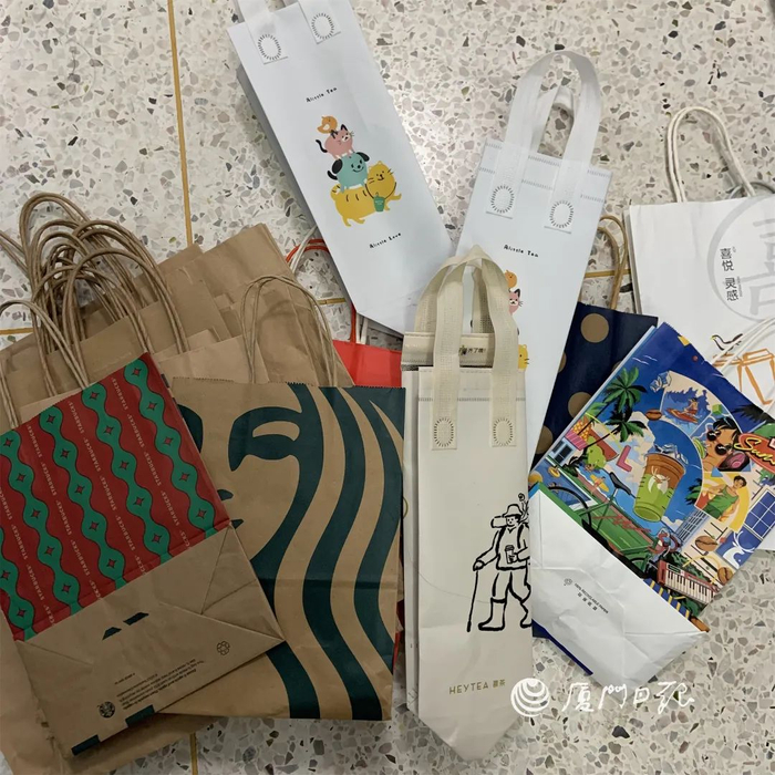 像瑞幸、喜茶等品牌会不定期推出不同图案的袋子,有些奶茶品牌还会推出“联名款”袋子,这些袋子不仅实用,有人还特意收藏。