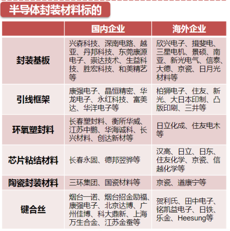 环氧塑封料是用于半导体封装的一种热固性化学材料,涉及上市公司包括华海诚科等;陶瓷封装材料涉及上司公司包括三环集团、国瓷材料等;键合丝涉及上市公司包括康强电子等。
