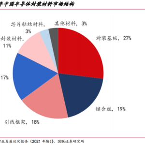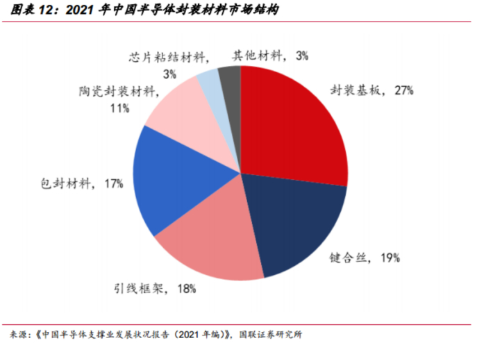 从中国半导体封装材料市场结构来看,2021年27%的市场来自于封装基板,19%的市场来自于键合丝,18%的市场来自于引线框架,17%的市场来自于包封材料,前四大品类占据83%的半导体封装材料市场。