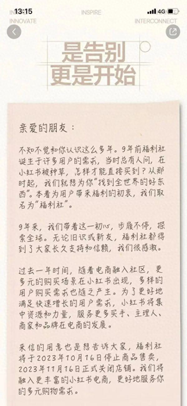 9月15日,小红书福利社发布致用户的一封信《是告别,更是开始》,表示为了更好地满足快速增长的用户需求,小红书将集中资源和力量,服务更多买手、主理人、商家和品牌在电商的发展。福利社将于10月16日停止商品售卖,11月16日正式关闭店铺。