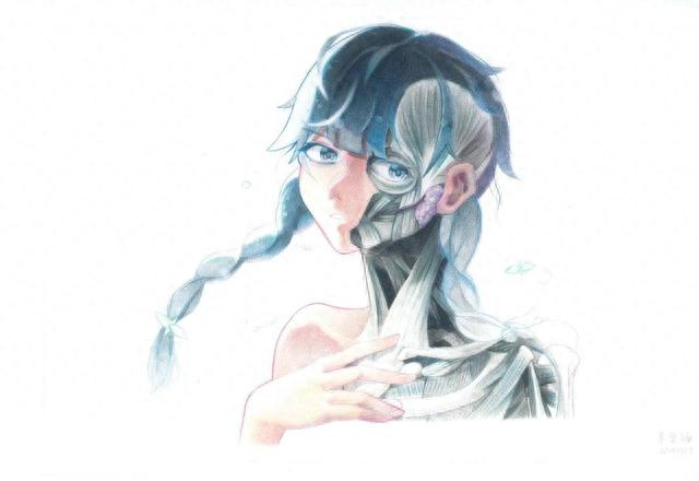 你知道吗?你的身体其实有着“铜墙铁壁”。在体现解剖学的绘画中,2022级预防医学专业的朱可涵带来了一副动漫风格的人物画。画中的动漫少年侧转头颈,似乎在凝视着你。一侧的眼睛似水般灵动,肌肤如苇膜般纤薄,仿佛一丝风、一缕阳光就能将其消融。另一侧则通过透视展示了颞肌、腮腺、胸锁乳突肌和胸廓等结构,这些结构表明了看似脆弱的少年外表下,其实有着钢铁般的血肉和意志,不可摧毁。