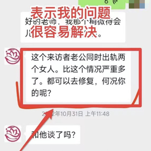 韦女士说,在咨询时,一位自称是“高级顾问黄老师”的工作人员告诉她,“98%的婚姻都可以通过专业的方法去修复”,并且向她介绍了多个成功案例。根据韦女士提供的聊天记录,对方曾举例表示,“这个来访者老公同时出轨两个女人,比你这个情况严重多了,都可以去修复,何况你的呢?”