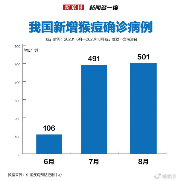 根据中国疾控中心公布的数据,6月中国内地新增报告106例猴痘确诊病例,7月新增报告491例,8月新增报告501例。3个月内,本土猴痘病例累计已经超过千例。