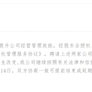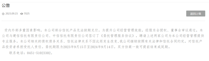 中融信托表示,本公司相关的债权债务关系、信托法律关系不因此而发生改变,该公司继续按照有关法律和信托合同约定,对信托产品投资者承担受托人责任。委托期限为2023年9月15日至2024年9月14日,双方协商一致可提前结束或延期。
