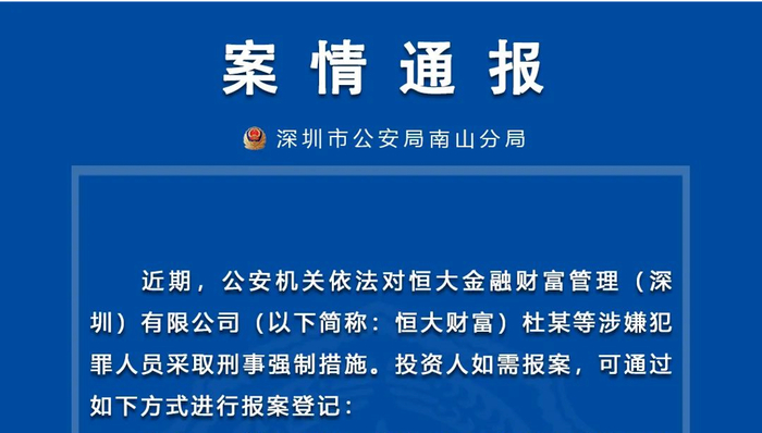 9月16日晚间,“深圳南山公安”微信公众号发布案情通报称,公安机关近期依法对恒大金融财富管理(深圳)有限公司杜某等涉嫌犯罪人员采取刑事强制措施,相关投资人可进行报案登记。