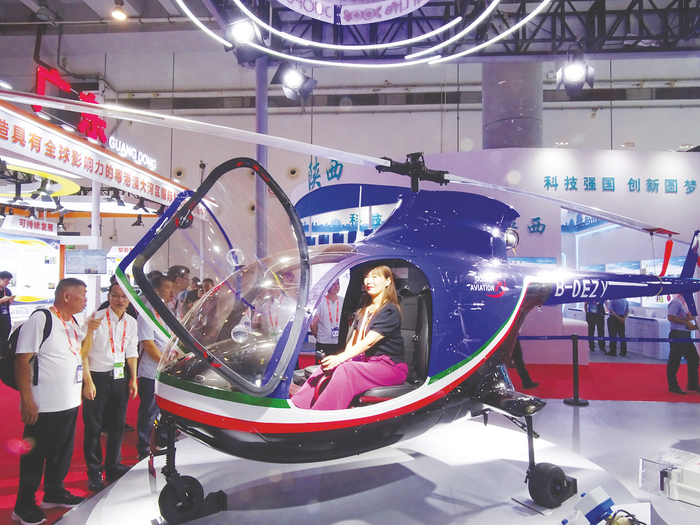 昨日,记者走进先进技术展区,看到一架蓝白红相间的直升机吸引众多科技迷抢先体验。据介绍,这是多弗国际控股有限公司自主研发的轻型单发涡轴直升机K216,是全球少有的采用180马力涡轴发动机的轻型直升机,重量仅为同排量活塞发动机重量的2/3,最大速度205公里/小时,功率提升接近20%,填补了中国轻型直升机和发动机先进制造技术及产品的空白。
