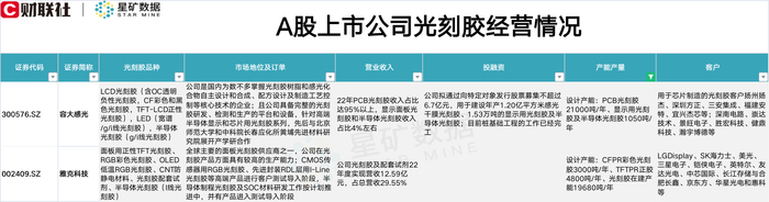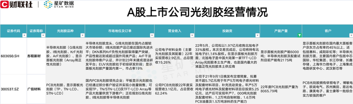 据财联社星矿数据统计,22年光刻胶相关产品营收占比超30%的A股上市公司包括容大感光、江化微、广信材料、强力新材,具体情况见表格如下: