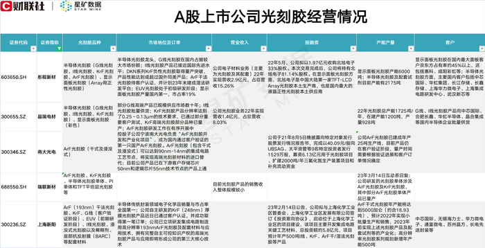 值得一提的是,华金证券7月18日研报指出,摩尔定律趋近极限,高端光刻胶需求增加,国内外厂商将逐鹿 KrF、ArF光刻胶。财联社星矿数据显示,A股上市公司中,已实现Arf光刻胶量产的厂商包括南大光电、上海新阳、晶瑞电材、彤程新材和瑞联新材,具体情况见表格如下: