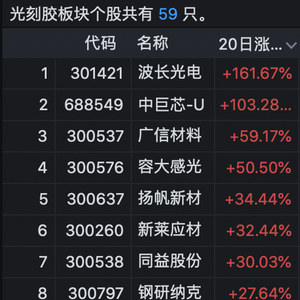 财联社9月17日讯(编辑 俞琪)半导体细分方向光刻胶跑出多只大牛股。自8月底迄今,主营PCB光刻胶的广信材料股价累计最大涨幅为106%;拥有紫外线正胶等光刻胶产品的容大感光以及旗下DKC光敏剂等产品涉及光刻胶领域的同益股份股价累计最大涨幅均超过八成。次新股波长光电和中巨芯自8月上市迄今股价累计最大涨幅分别达228%和200%。据悉,波长光电开发的光刻机平行光源系统可用于国产光刻机领域配套;中巨芯主营业务涉及先进封装领域的光刻胶等。