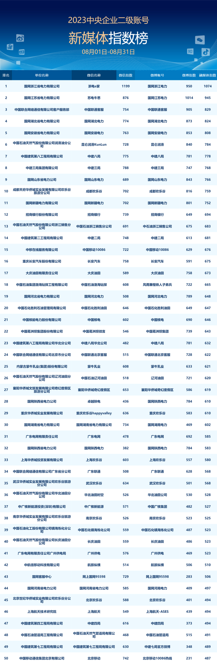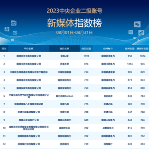 从2014年起,国资委新闻中心(@国资小新)联合清华大学新闻研究中心、清博指数、中国企业联合会、中国经济网、《中国企业家》杂志发布“央企二级账号新媒体指数榜”,由以往单一新媒体平台评估升级为融合微信、微博双平台的综合评价指标体系,收集、分析了2023年8月1日-8月31日期间600多个中央企业二级新媒体账号的基础数据,对企业微信、微博运营的实际绩效和影响力进行专业性考量。