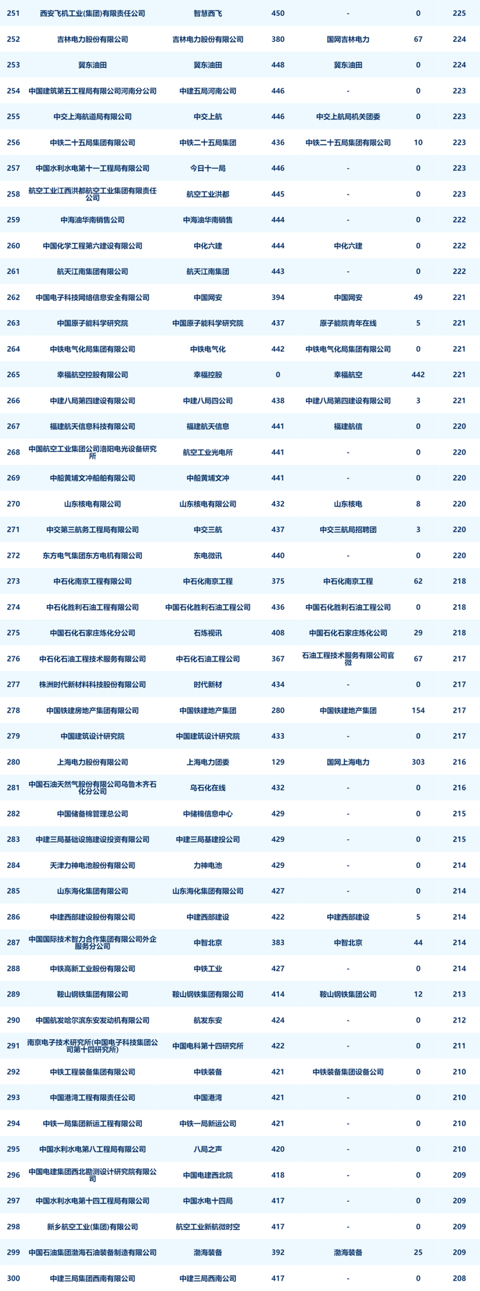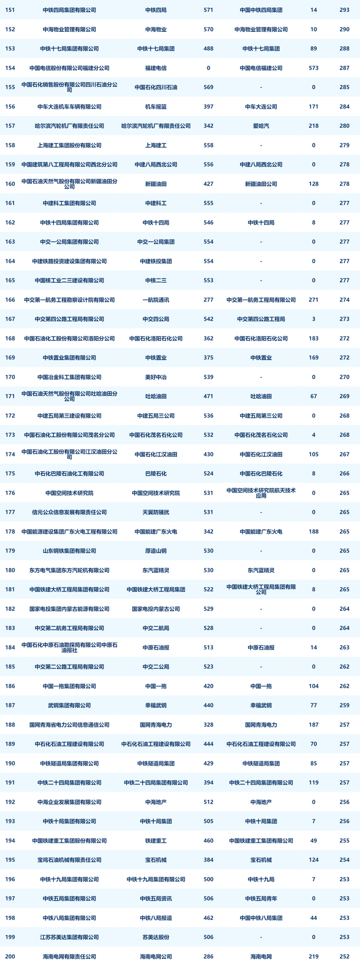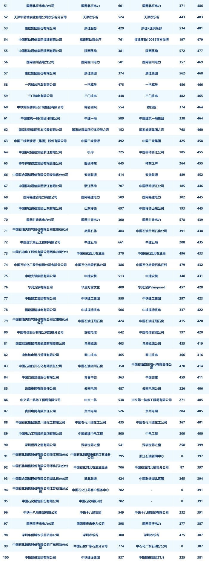 8月进入榜单前二十名的企业分别是:国网浙江省电力有限公司、国网江苏省电力有限公司、中国联合网络通信有限公司客户服务部、国网湖北省电力有限公司、国网安徽省电力有限公司、中国石油天然气股份有限公司润滑油分公司、中国建筑第八工程局有限公司、中建三局集团有限公司、国网山东省电力公司、成都天府华侨城实业发展有限公司欢乐谷旅游分公司、国网新疆电力有限公司、招商银行股份有限公司、中国石油天然气股份有限公司浙江销售分公司、中国建筑第二工程局有限公司、中移在线服务有限公司、重庆长安汽车股份有限公司、大庆油田有限责任公司、中国石油集团渤海钻探工程有限公司、国网河北省电力有限公司、中国石化胜利石油管理局有限公司