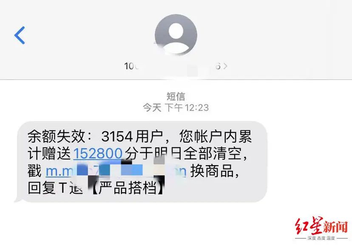 近日,一位中国联通的手机用户中午12点23分左右,收到一则短信息,发件内容是“余额失效:您账户内累计赠送152800分于明日全部清空,戳某某网站换商品,回复T退【严品搭档】”。