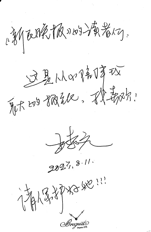 两个月后,这个励志的故事被写成了报道《有条道路叫爱护——记本市中学生王志文考入电影学院》,发表在新民晚报第二版。自此,王志文对家乡的这张报纸给予他人生的第一次重要记录存下了一份感念之心。“39年过去了,再次接受晚报的采访,我觉得有意义。”沉吟了片刻,他拿起水笔,在之前写定的读者寄语后面又补了一句:请好好保护她!笔迹有力。