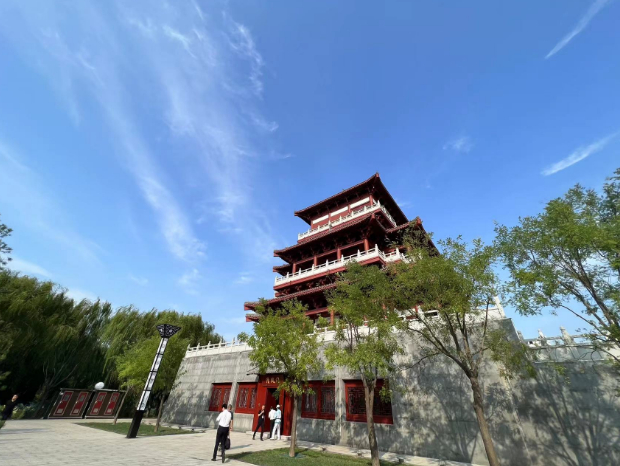 游客服务中心建筑仿汉唐风格建造,门口的车马驿,让人联想到古代的驿站。古代的驿站是住宿、换马或喂马的地方,而现在的驿站设有美食小吃一条街、停车场和充电桩,功能齐全。