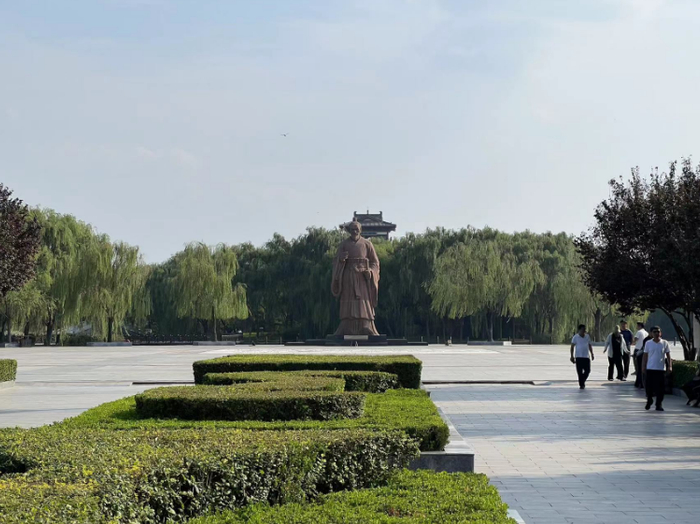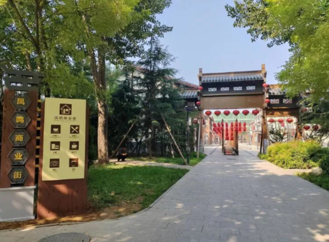 进入景区,首先经过的是模仿《诗经》中市井生活打造的凤鸣商业街。这里有雕梁画栋,井亭经堂,虹桥飞梁,酒幌商幡,再加上雕塑壁画、主题小品、楹联花牌等等,踏入这条古风商业街,恍如穿越千年,化身春秋古人,又走进了三千年前的寻常巷陌。