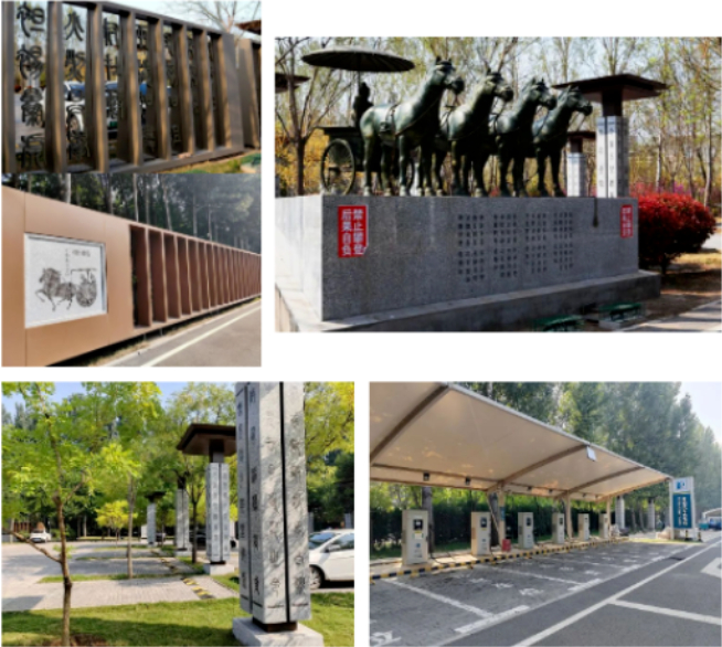 唐朝著名诗人白居易曾经写到:每到驿亭先下马,循墙绕柱觅君诗。这座停车场就是围绕这个意境打造的。在停车场36根立柱和前面左右两侧围墙上,都刻着用小篆书写的诗词。这些诗词都出自《诗经》,而且都跟车马有关。比如“子有车马”“择有车马”出自《诗经》。