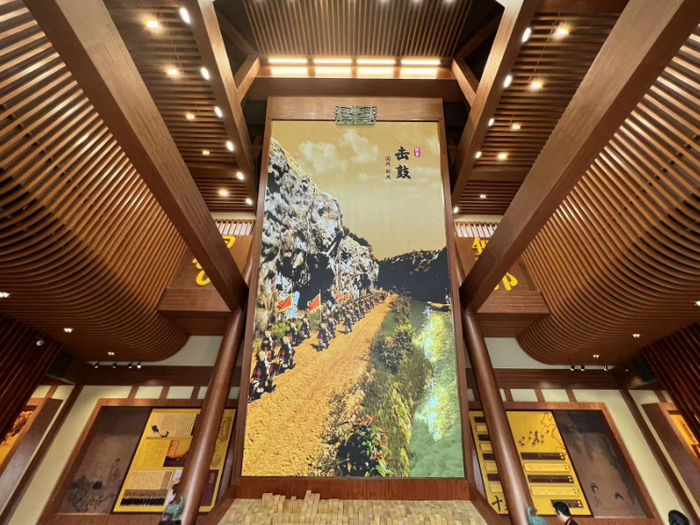 在底座月台前呈现在面前的屏风,描述了鸡泽“毛姓”的由来,西周初年,周文王之子姬郑(毛叔郑)被封毛国,其后代以国为氏,是为毛氏。后人毛班因功加封古巨鹿(今鸡泽县),因此“毛姓”在鸡泽流传下来。公元前257年,秦军围困赵都邯郸,毛氏22世祖毛遂自荐请缨,以三寸之舌说服楚国出兵,气吞云梦,留下“毛遂自荐”千古美谈。毛遂后人毛亨毛苌叔侄绪衍《诗经》,流芳百世。