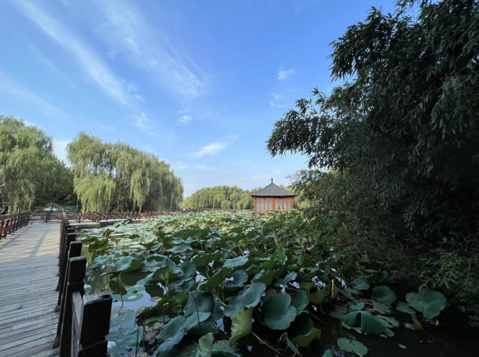 位于龙湖的荷塘是游客们竞相打卡的网红地标。每到夏天,这里铺满荷叶,荷叶田田,鱼戏叶间,灼灼荷花,亭亭玉立,美不胜收。这时,你就能深切体会到朱自清先生《荷塘月色》中描绘的美景,每逢走到这里,大家就会不由自主地吟诵起来:曲曲折折的荷塘上面,弥望的是田田的叶子。叶子出水很高,像亭亭的舞女的裙。层层的叶子中间,零星地点缀着些白花,有袅娜地开着的,有羞涩地打着朵儿的;正如一粒粒的明珠,又如碧天里的星星,又如刚出浴的美人。微风过处,送来缕缕清香,仿佛远处高楼上渺茫的歌声似的。