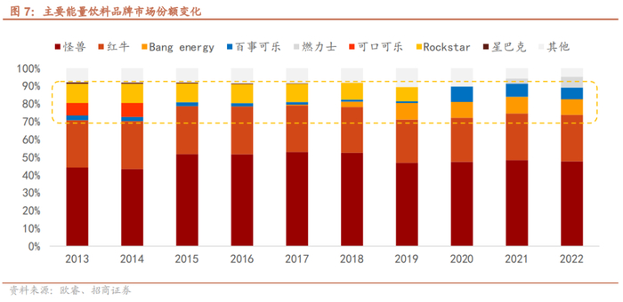 CR2集中度高,Monster总份额超红牛。美国能饮行业龙头为Monster和红牛,二者整体份额超过70%,市场集中度高。Monster单品牌份额虽不及红牛,但加上其2015年通过与可口可乐协议中收购的可乐旗下的能量饮料品牌,整体份额超过红牛,是美国第一大能量饮料公司。
