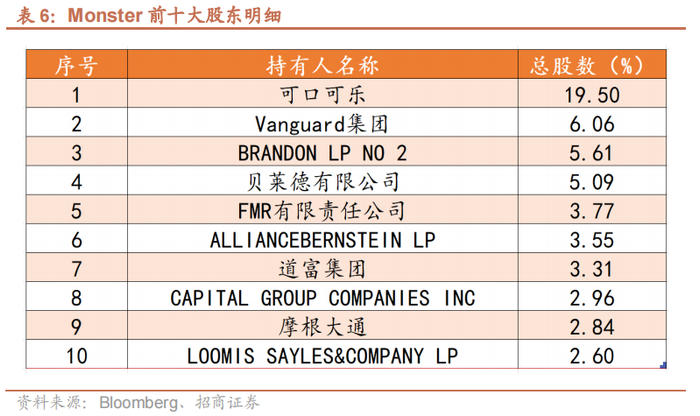 可口可乐为第一大股东。公司第一大股东可口可乐,是Monster全球首选分销伙伴,持股比例19.5%。其他大股东主要以投资机构为主。前十大股东整体占比55.3%,股权相对分散。