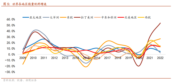 趋势席卷全球,南美、亚太地区快速增长。与此同时,北美以外市场呈现了快速增长趋势,2008-2022年期间,南美、亚太地区的复合增速分别为11.6%、10.3%,东欧、大洋洲地区增速也高于北美地区。2022年,除亚太地区和大洋洲地区以外,其余地区能量饮料市场均为双位数增长,其中拉丁美洲增速显著,达53.6%。