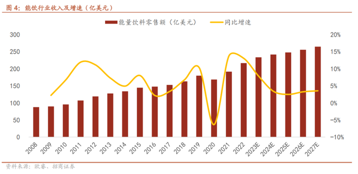 美国本土行业增速预计回归平稳。2009年前后,美国能量饮料零售额规模增速回归到10%以内的水平。根据欧睿数据,2008-2022年美国能量饮料市场复合增速6.6%,预计未来5年低个位数复合增长。