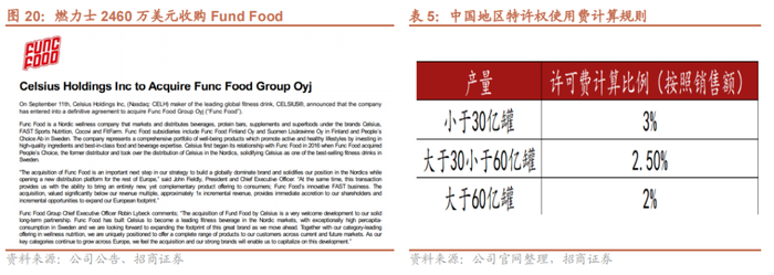 本土新势力不断崛起。Monster在2009年反超红牛成为行业市占率第一的品牌,之后一直保持着行业相对领先的地位。燃力士通过高昂的费用投入和渠道建设,加上与百事的股权合作,近年来份额快速提升。传统饮料巨头调整自身能量饮料品类的发展策略,以收购、投资为主,不直接参与行业(可口可乐2015年将能饮品牌出售给Monster,百事可乐2020年收购Rockstar),这给予了新进入企业更大的发展空间。