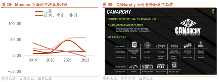 未来驱动力一方面来自于国内市场继续推陈出新,包括创新的产品、口味等。22年公司3.3亿美元收购了CANarchy Craft Brewery(美国第六大啤酒商,销售啤酒气泡酒为主),补充业务线,同时继续推新,2023年1月相继推出MonsterEnergy® Zero Sugar、Monster Energy® Ultra StrawberryDreams、Monster® Reserve Kiwi Strawberry等新品。