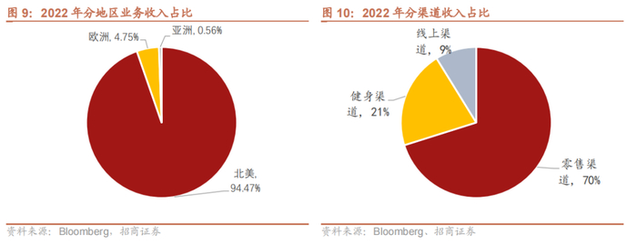 零售渠道为主,线上渠道发展迅速。渠道上,零售渠道仍是最主要渠道,占比70%左右,2020年疫情后公司线上渠道快速发展,当前占比9%左右,而健身渠道疫情受损,2022年随场景放开恢复至21%。