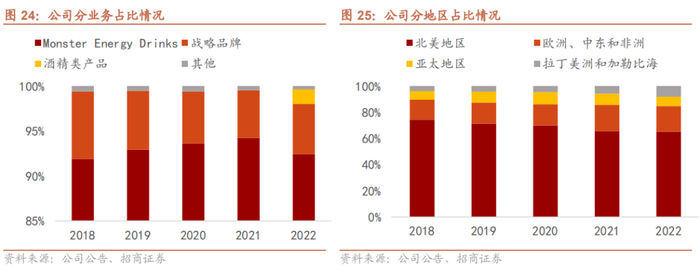 分业务:公司主打的Monster Energy Drinks占比92.4%,公司在于可口可乐的交易中(TCCC)收购了可口可乐旗下的能量饮料子品牌,作为战略品牌(Strategic Brands),2022年战略品牌占公司整体营收的5.6%。