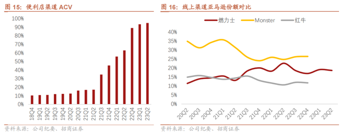 分销与直销模式相结合,渠道渗透率持续提升。2016年之前,公司以分销渠道为主,向全国市场渗透。2016-2019年,公司加大直销比例,与分销模式结合,在大型零售终端及卖场加大渗透,以及便利渠道覆盖。公司便利渠道ACV(渗透度)从2018年10%,提升至2022Q1的56%。2020年后,线上渠道放量,弥补健身房渠道损失。2022年下半年公司和百事可乐合作,借助其强大的渠道渗透能力进一步拓展终端覆盖面,使得当前渠道渗透度大幅提升,2022Q4公司便利店ACV进一步提升至93.4%。