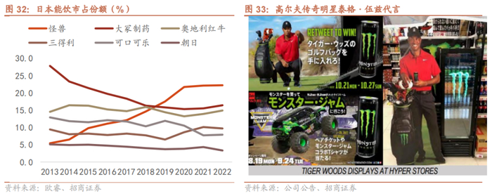 渠道上, 2011年8月17日,公司与本土最大饮料品牌之一朝日饮料(Asahi)签订了分销协议,开始在日本全境独家经销Monster产品,顺利进入壁垒较高的当地便利店和自动售货机,节省了大量的渠道布局时间和精力。在朝日的渠道助力下,Monster很快提升了便利渠道渗透率,并进一步拓展到超市、百货店等渠道,市占率快速提升。