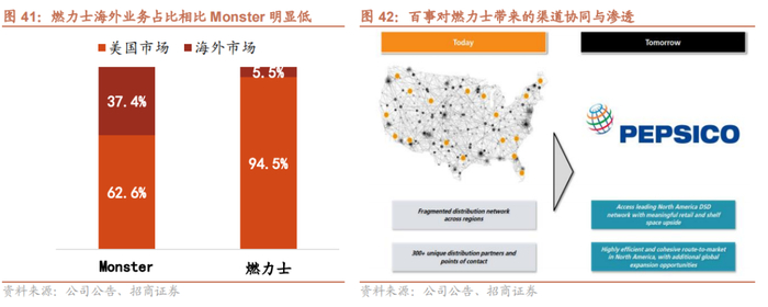 各品牌不断开启国际化策略。燃力士和百事可乐签订了长期分销协议,将大量的独立分销商过渡为全国性合作伙伴,百事可乐凭借一流的北美分销网络和全球影响力已成为燃力士在美国的首选分销商,未来将成为公司首选的全球分销合作伙伴。Monster与可口可乐合作,实现了全球渠道网络的渗透,近年国际收入占比持续提升。