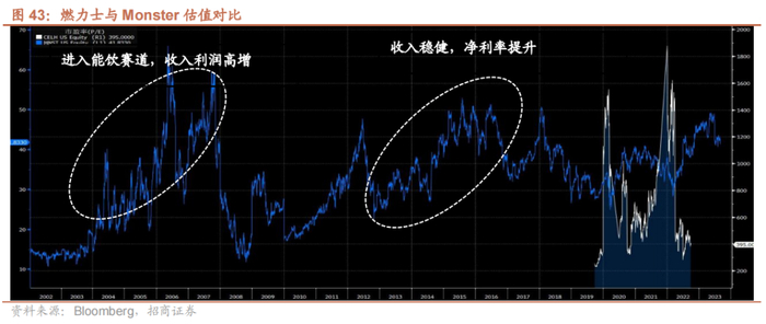 估值分析:借鉴Monster历史估值走势看,Monster历史上经历了2次估值中枢上行,分别是: