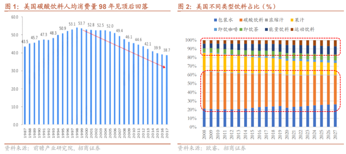健康化趋势下,碳酸饮料消费见顶。90年中后期,随着美国城镇化率水平及人均可支配收入的不断攀升,居民对于消费品个性化的属性追求和健康意识不断增强,同时满足个性化诉求的替代品纷纷涌现,使得碳酸饮料行业增速放缓。1998年传统碳酸饮料人均消费量见顶,2005年后总消费量连续下滑。