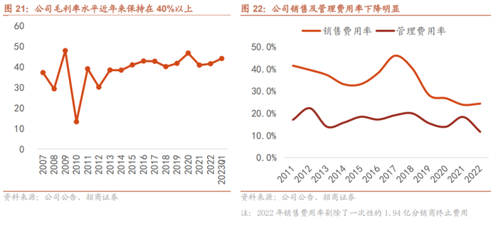 毛利率看:2010年下降主要由于当年促销力度大所影响,2021-2022年下滑主要由于铝价上涨,原材料成本提升所致。未来看,通过规模效应和分销仓储的建立,公司有望提升效率摊销成本,从而提高毛利率,预计未来毛利率保持45%左右;