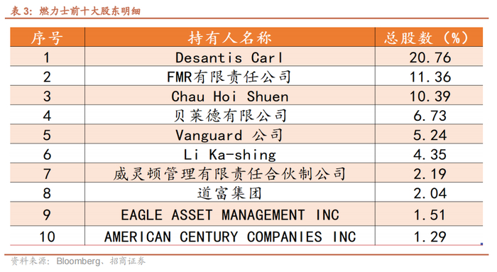 公司前十大股东以机构投资者为主,也包含个人股东,其中第一大股东DesantisCarl,是CDS Inti Holdings Inc创始人,作为燃力士第一大股东,持股比例20%。此外前10大股东中还包含ChauHoi Shuen(周凯旋,中国香港),维港投资集团有限公司创始人,以及李嘉诚。其他则均为机构投资者。公司前十大股东整体占比65.9%。