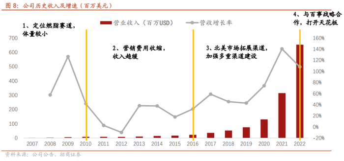 2007-2010年:定位燃脂细分赛道,大力营销建立品牌认知,拓展分销渠道,但体量仍较小。