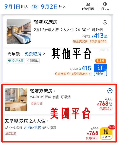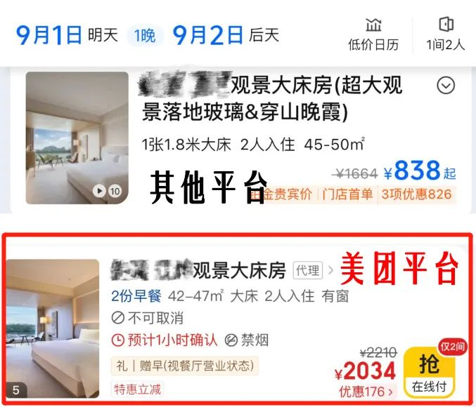 不同平台的酒店价格对比,红色框为美团平台显示的价格